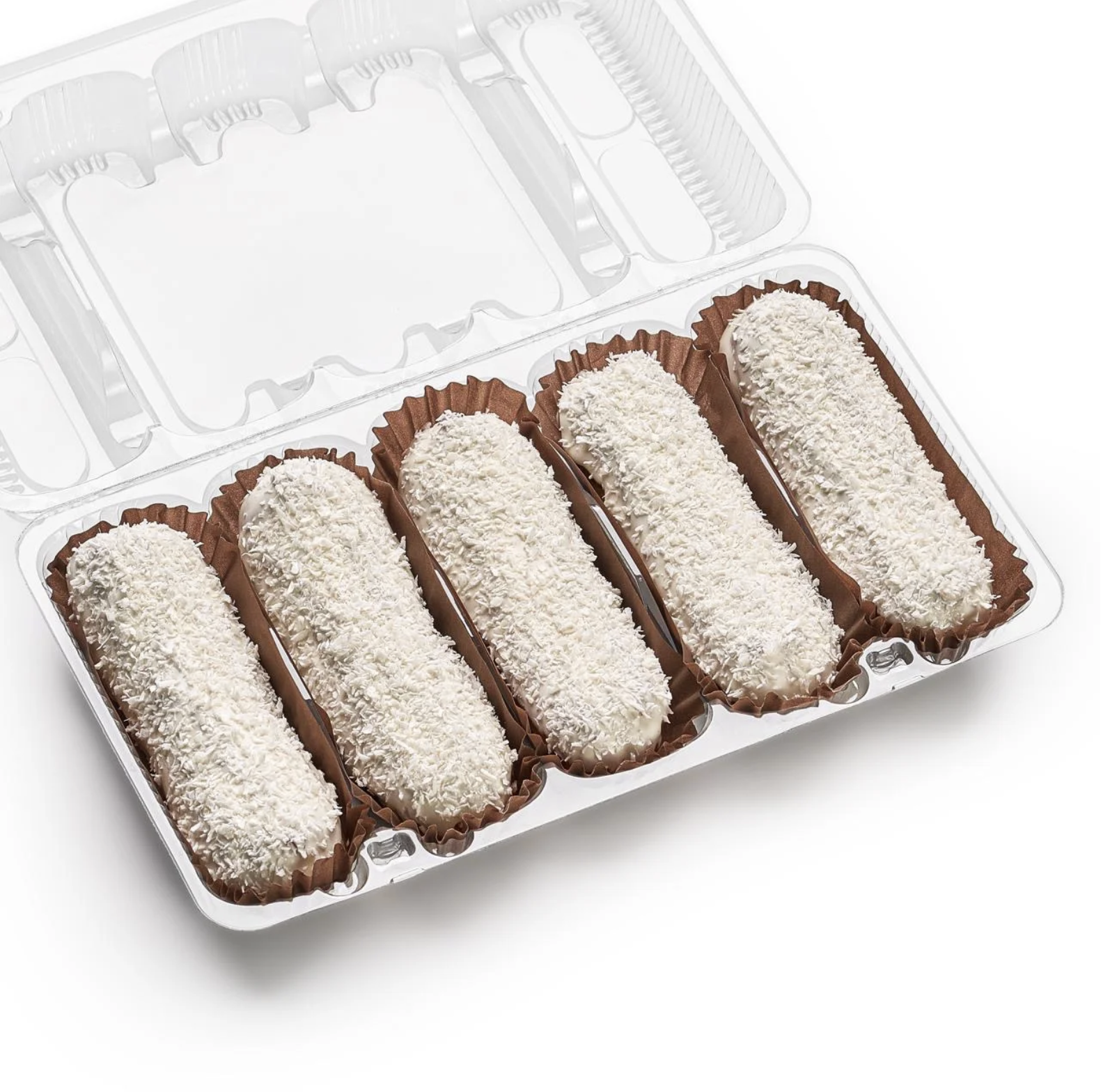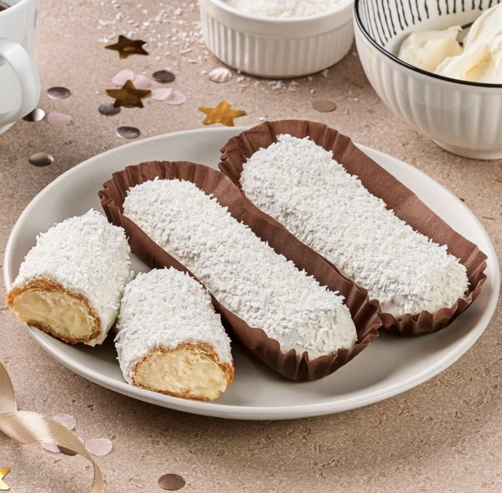 Пирожное из нежного заварного теста - таящий во рту десерт с кремом на основе кокосового молока и с добавлением хрустящей начинки из кокосовой стружки, дроблёного миндаля и слоёной крошки. Декорирован белой глазурью и обсыпан кокосовой стружкой.