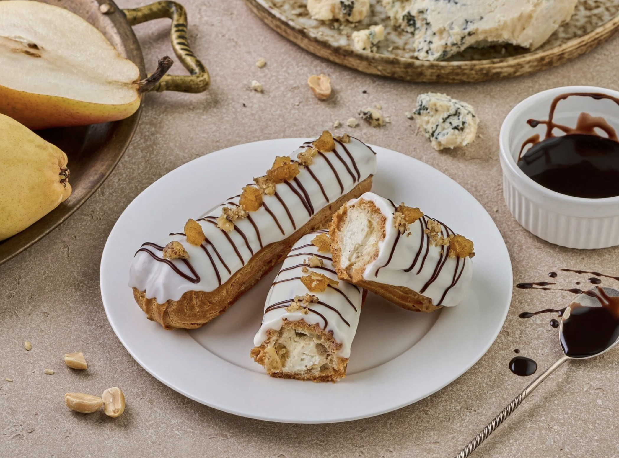 Пирожное из нежного заварного теста со сливочно-сырным кремом и карамелизированной грушей, декорированное глазурью, грецким орехом и кусочками груши.