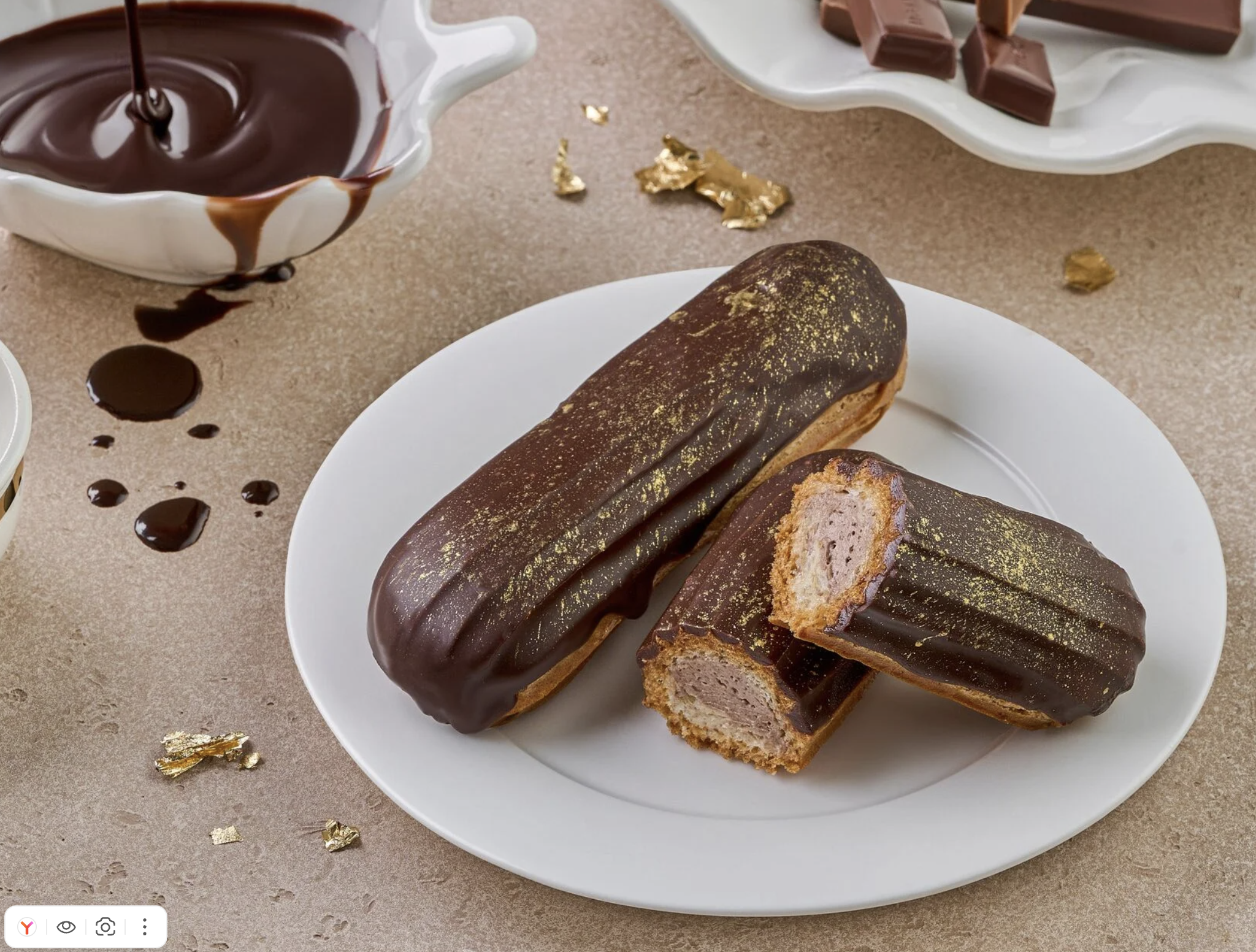 Пирожное из нежного заварного теста с шоколадным сливочно-сырным кремом, декорированное шоколадной глазурью.